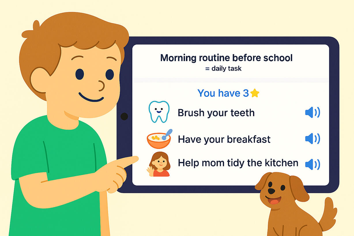 Rotinas com orientação por voz — instruções em áudio para os pequenos e pré-leitores